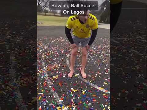 Jugando a fútbol con bolas de bolos descalzo sobre legos