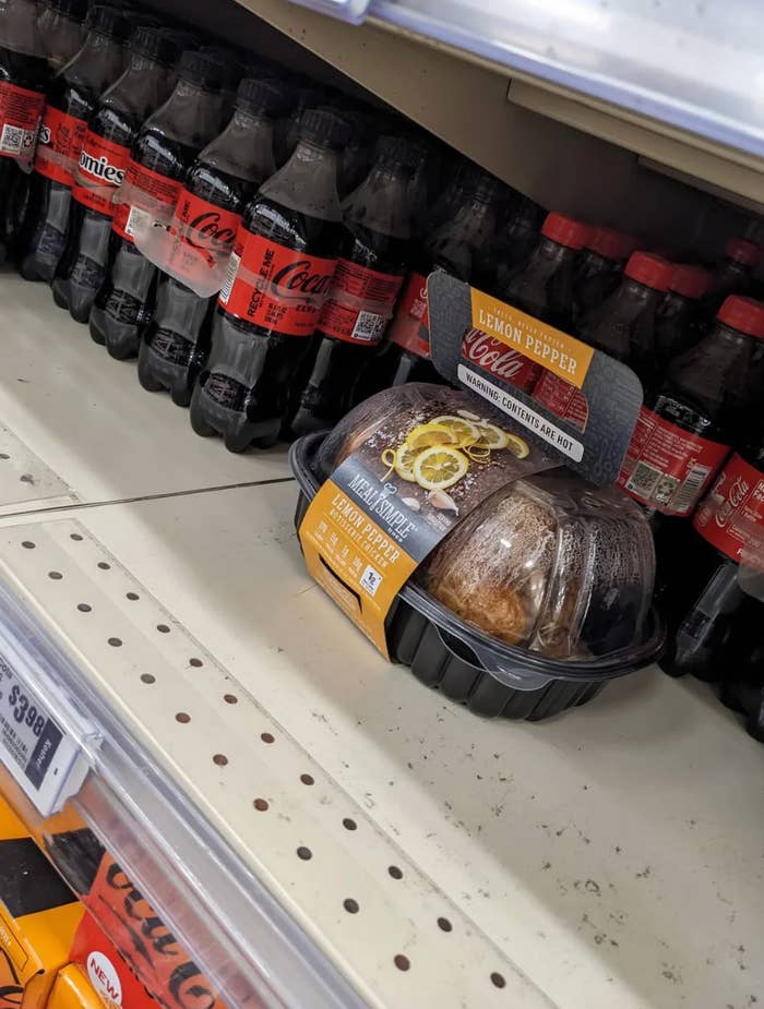 - El trágico final del pollo asado: Alguien decidió en el último momento que le apetecía más un refresco que un plato caliente y dejó un pollo asado abandonado en el pasillo de las bebidas. Como bien dijo el autor de la foto, «El pollo murió en vano porque alguien cambió de opinión».