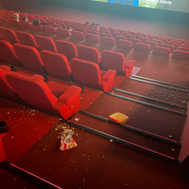 - Salas de cine convertidas en vertederos: Hay personas que confunden la butaca del cine con el cubo de la basura. Imagina a los pobres empleados que tienen que limpiar una sala entera cubierta de palomitas y envoltorios en tan solo 30 minutos.